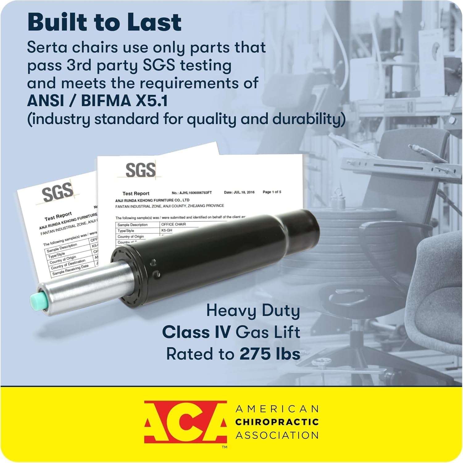 - SERTA FOAM & CERTIFICATION: All Serta chairs use quality, non-recycled, non-toxic foam, exceed minimum industry testing standards, and are certified by the American Chiropractors Association.